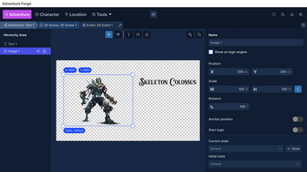 Design interactive Scenes, Events, and User Interfaces with a versatile 2D Editor. Just drop images or text into the canvas and define what happens when players interact with them. Whether you're crafting custom user interfaces, visual novels, minigames, puzzles, or dynamic maps, the intuitive drag-and-drop interface makes it easy to bring your ideas to life.