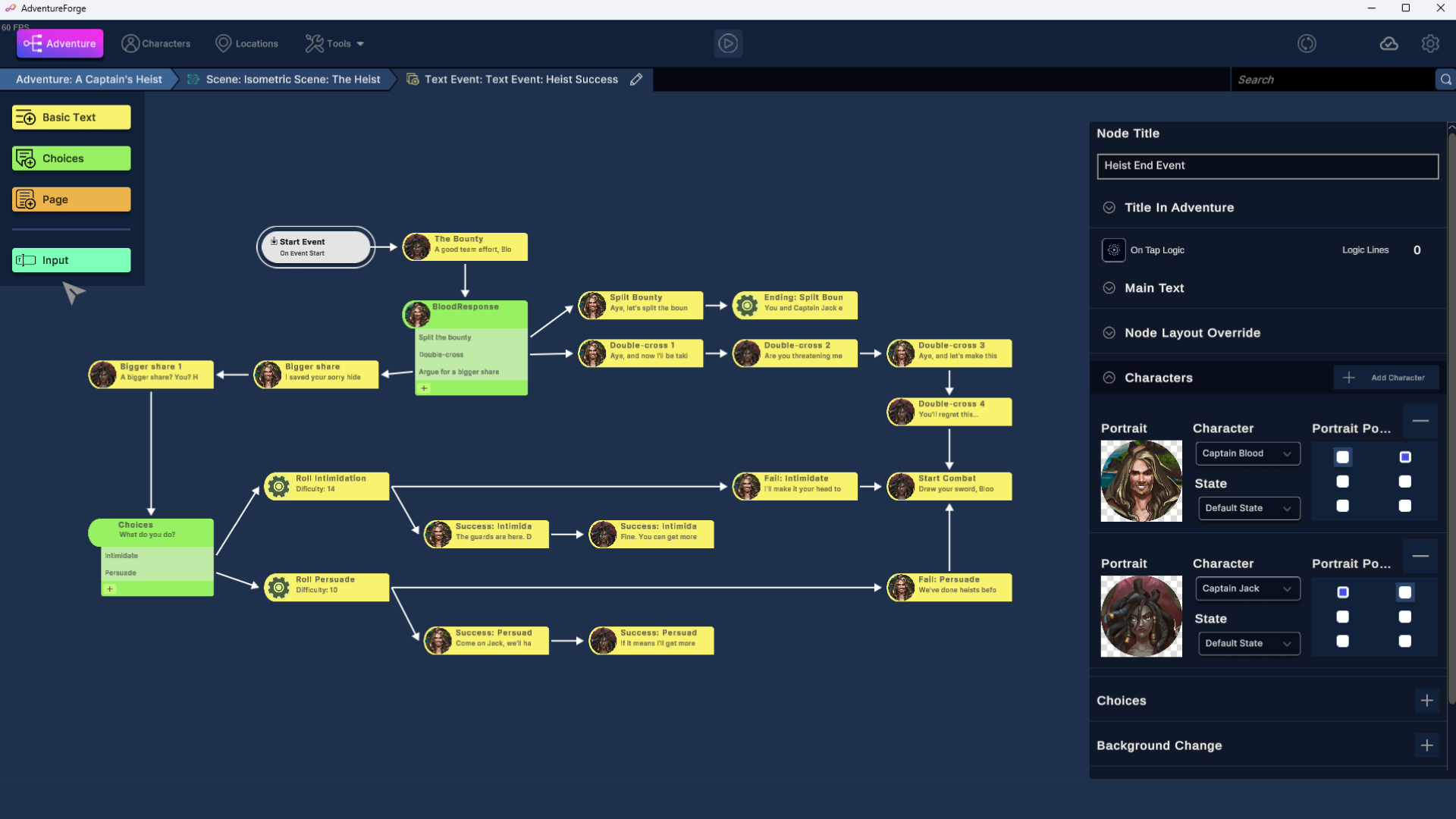The core of Adventure Forge is the Adventure Flow which visually illustrates the flow of your game. Adventures are constructed from Scenes and within scenes are Events, this tiered system enables designers to layer different types of interactions such as having conversations appear over a visual novel or a lockpick mini-game over an isometric RPG. This nested approach allows every Scene and Event to contain its own logic thus avoiding the problem of a giant tangled web of branches and logic.