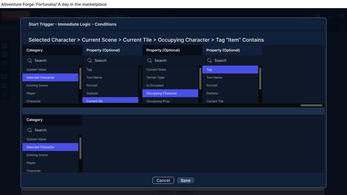 Creating branching conversations and game logic is simple, fast, and all that’s needed for most games, but branching does have limits for interactivity and scalability. Adventure Forge provides an additional more powerful and flexible way to connect conversation nodes, scenes, events, and logic blocks which we call Weighted Navigation.